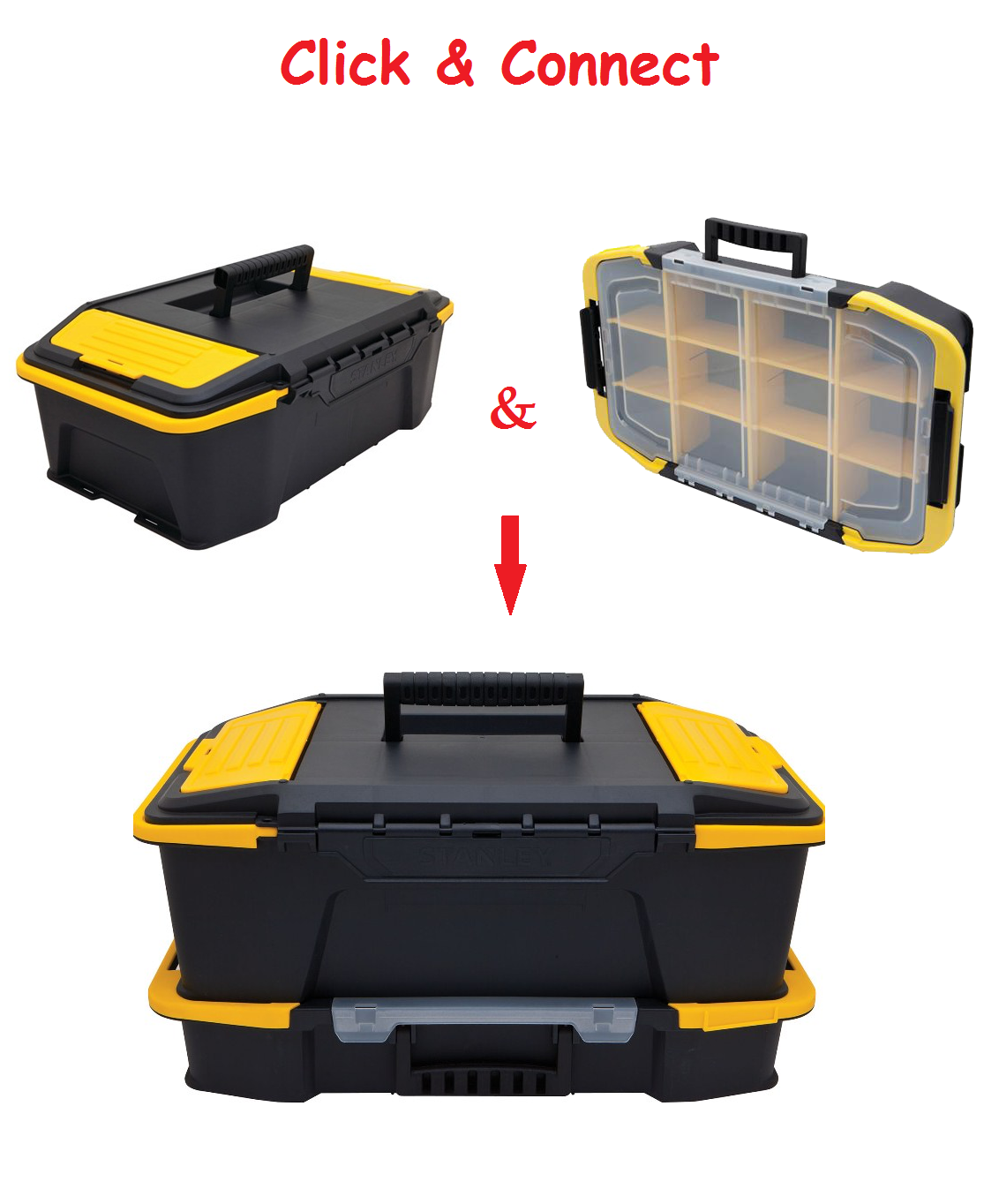 The STANLEY Click N Connect Deep Toolbox is part of the flexible STANLEY Click N Connect Storage System which features removable dividers for customized organization of tools and parts. The unique shape and proportions of the system allow for easy access to both hand and power tools and also features lid organizers for small parts and accessories.