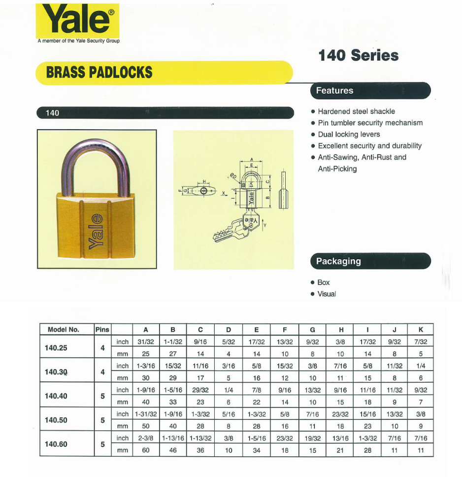 PRODUCT CODE & SIZES: • V140.20 - 20mm • V140.25 - 25mm • V140.30 - 30mm • V140.40 - 40mm • V140.50 - 50mm • V140.60 - 60mm • V140.70 - 70mm FEATURES: • Body material: Solid Brass • Shackle material: Hardened Steel • No. of keys: 3 • Extra strong hardened steel shackle • 4-pin or 5-pin keying mechanism (depending on the size) • Double locking • Excellent security and durability • Anti-rust, Anti-picking and anti-sawing